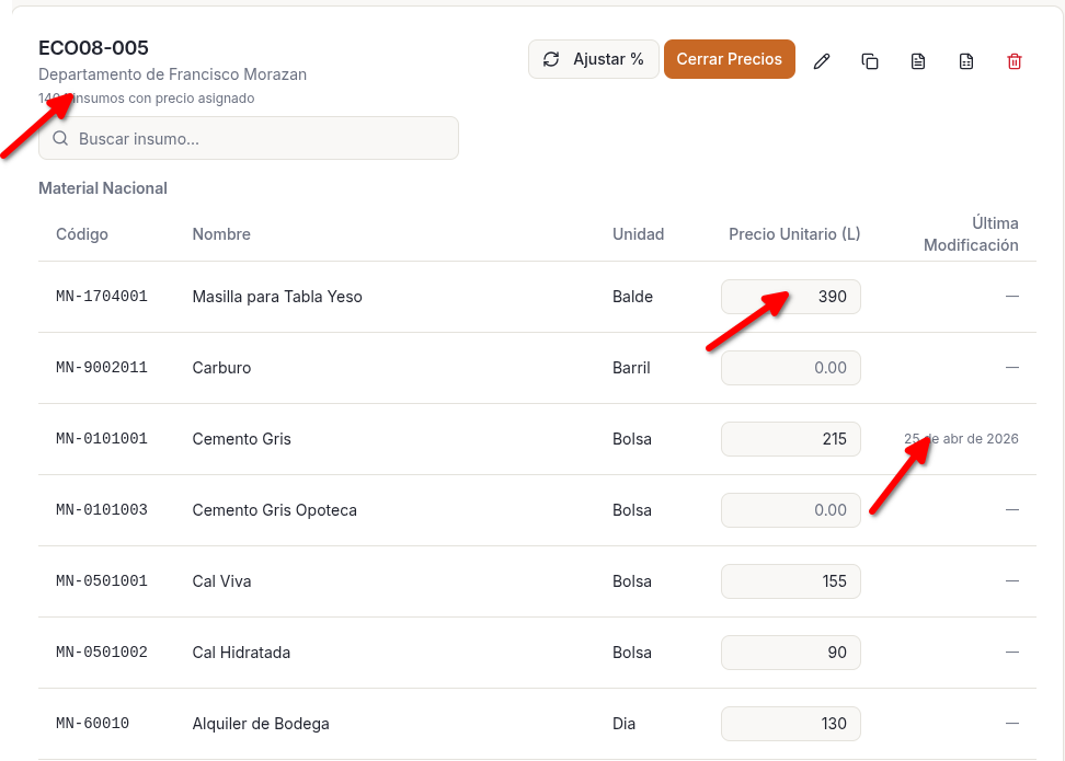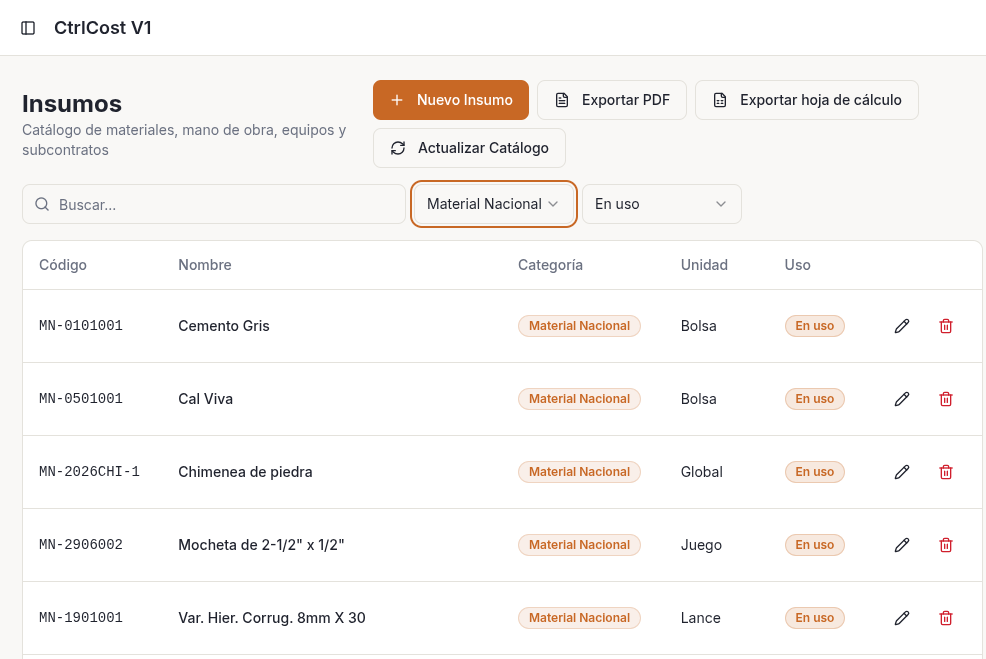 Catalogo propio de Materiales con precios históricos por proveedor, sabes si el cemento subió o bajo antes de comprar