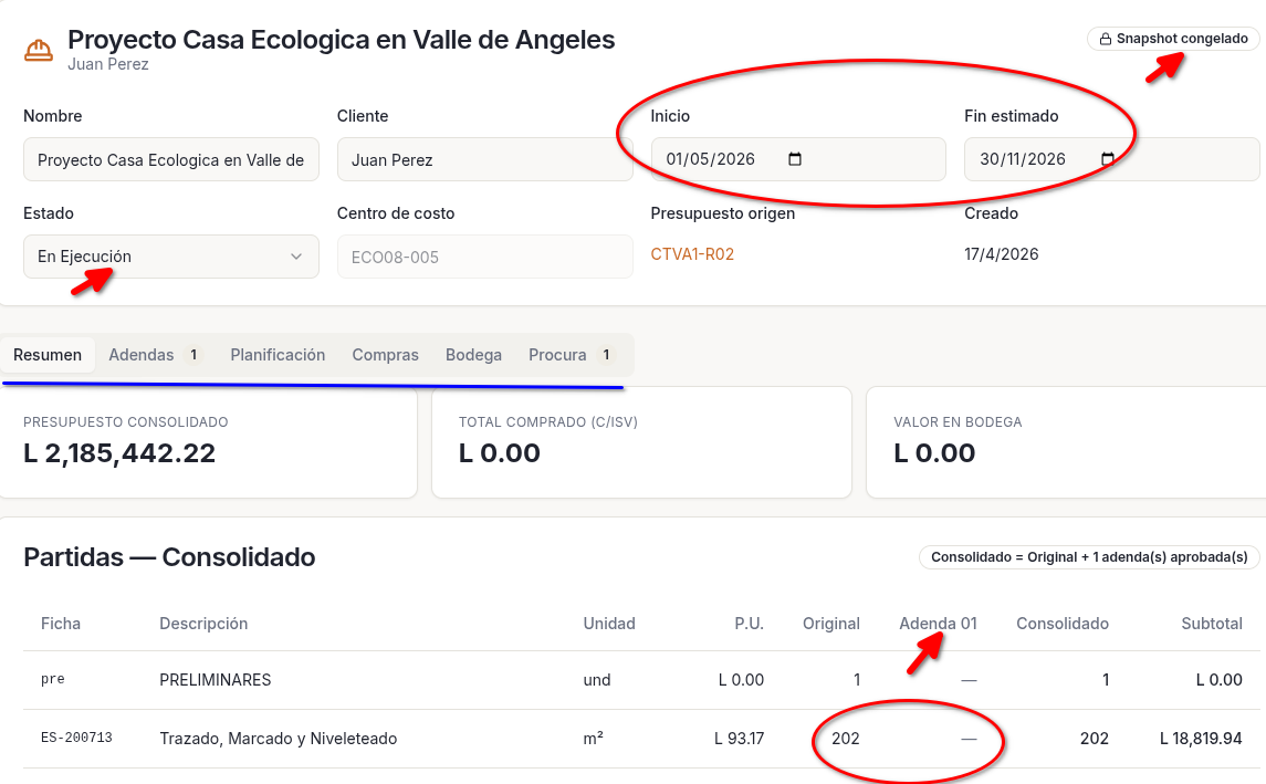 Presupuesto congelado listo para su ejecución, con opción de Adendas, Consolidado, recalcula todo, todo a la mano, colaborativo multiusuario,